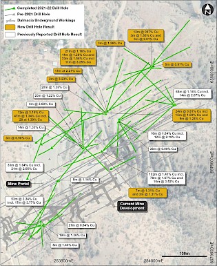 • DS-21-06: 32m grading 0.73% Cu including 16m at 1.15% Cu and 95m at 0.78% Cu including 29m at 1.45% Cu, including a higher-grade interval of 14m at 2.44% Cu