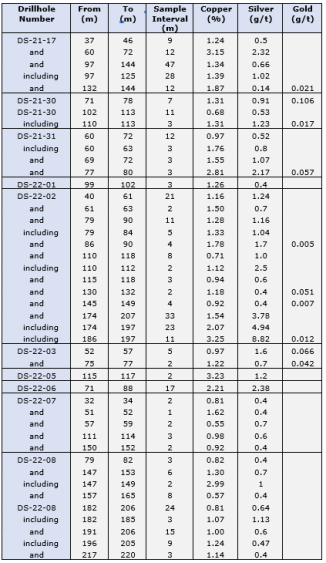 • DS-22-02: 21m at 1.16% Cu, 11m at 1.28% Cu and 33m at 1.54% Cu including 11m at 3.25% Cu