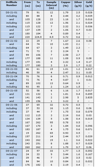 • DS-21-07: 33m at 1.77% Cu, including intervals of 9.0m at 3.44% Cu, and 7m at 2.54% Cu, and 10m at 0.84% Cu, and 6m at 2.19% Cu