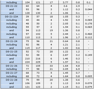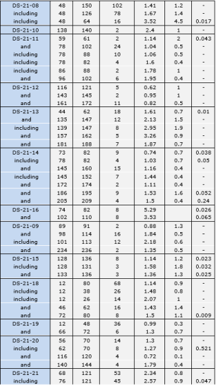 • DS-21-25: 20m at 1.22% Cu including 6m at 2.87% Cu and 6m at 1.46% Cu and 5m at 1.57% Cu