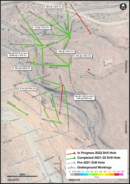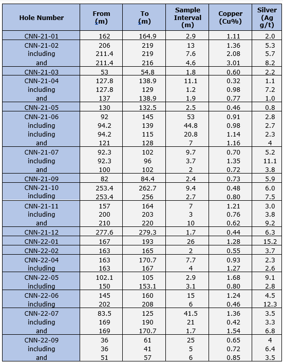 - CNN-21-02: 13m at 1.36% Cu including 7.6m at 2.08% Cu;
