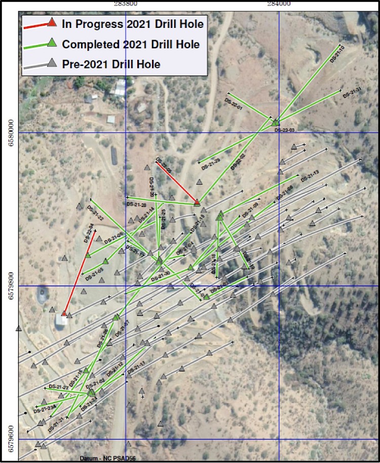 To date, a total of 6,504 meters in 33 holes completed with an additional 5 holes / 600m of infill and step out drilling is planned to complete the Phase 1 program (see Figure 2). Complete assay results were recently received for seven holes: DS-21-08, DS-21-10, DS-21-11, DS-21-12, DS-21-13, DS-21-14, and DS-21-16 (see Table 1). A summary of the target rationale and results for these new drillholes is below.