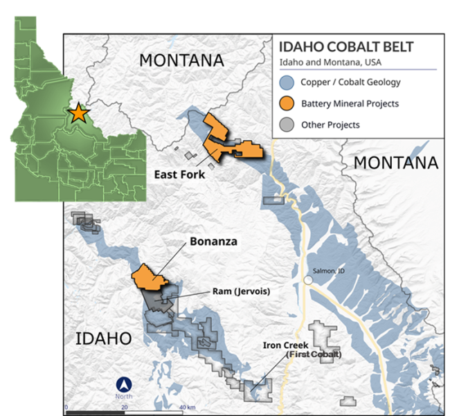 The Bonanza Project encloses an area of widespread copper-cobalt-gold mineralization, first recognized in the late 1800’s as a mineralized horizon offset by faulting from the Blackbird mining district immediately to the southeast, which includes Jervois Mining’s Ram Deposit, at the former Blackbird Cobalt Mine, which hosts a Reserve of 2.5 million tonnes of 0.55 percent cobalt (“% Co”), 0.8 percent copper (“% Cu”), and 0.64 gram per tonne gold (“g/t Au”) for 30 million pounds of contained cobalt and is currently under construction.