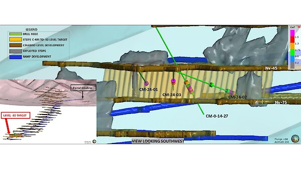Sample assay results, reported herein, are from the first three underground drill holes completed at Cinabrio as part of the 2024 drilling program. These first 3 drill holes are infill holes designed to verify and better delineate mineralization targeted for production between levels -45 and -70. One historical hole, CM-0-14-27, previously tested this target area returning 5.8m at 1.8% Cu and 1.2g/t Ag.