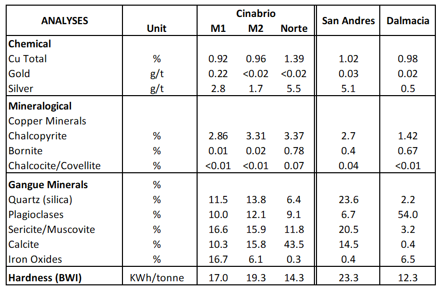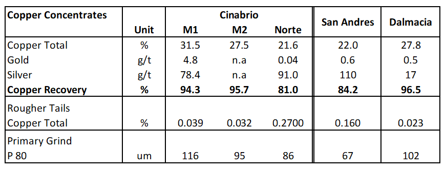 As previously announced in our June 9th press release, metallurgical studies confirmed that the combined copper concentrate to be produced from the four main deposits (Cinabrio, Cinabrio Norte, Dalmacia and San Andres) is commercially marketable and the company has received strong interest from several concentrate off-takers. Moreover, the testing demonstrated the combined future sources of ore to the Punitaqui mill demonstrate an average of overall 84% copper recovery – a 5% higher recovery than historically realised at Punitaqui by prior operators. Additionally, we are working to refine and improve upon these initial very positive results.