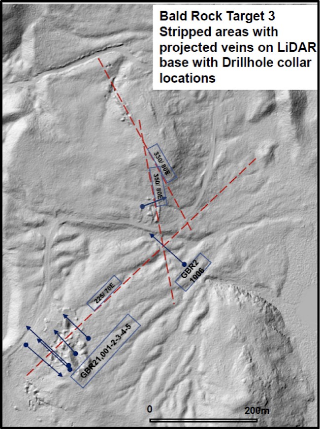 Figure 2: LiDAR image showing Bald Rock stripped area with the proposed diamond drillhole locations. Vein zones (red dashed lines) are projected from measured orientations on stripped outcrop areas