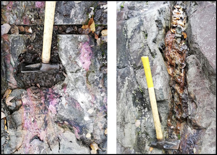 Photo 1: Left-typical Calcite (+/-quartz) vein with Cobalt bloom; Right- typical specular hematite vein; both types are found on the Bald Rock outcrop and in the historic prospect cut/pit.