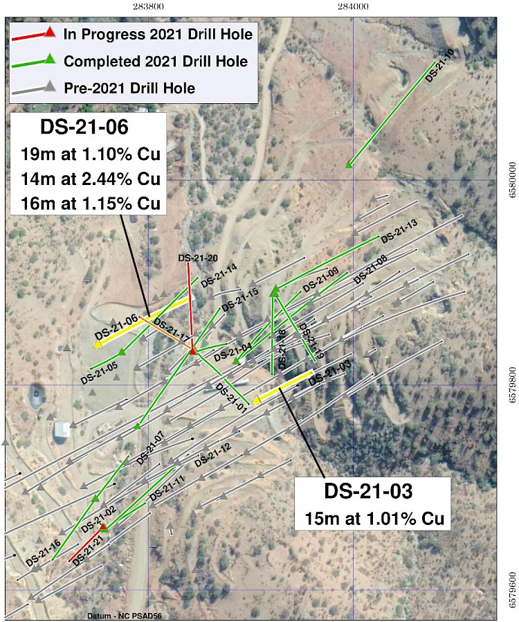 Drillhole DS-21-03 was designed as an infill drill hole to test Dalmacia mineralization in the south-central portion of the target 100m northeast of the mine portal. It was drilled in a northeast direction between drill holes DS-14-09 (9m at 1.62% Cu) and DAL-09 (7.0m at 1.66% Cu). DS-21-03 resulted in one intercept; 15m grading 1.01% Cu and 1.2g/t Ag from 46m downhole including 4m at 2.47% Cu, 3.1g/t Ag and 0.05g/t Au from 46m.