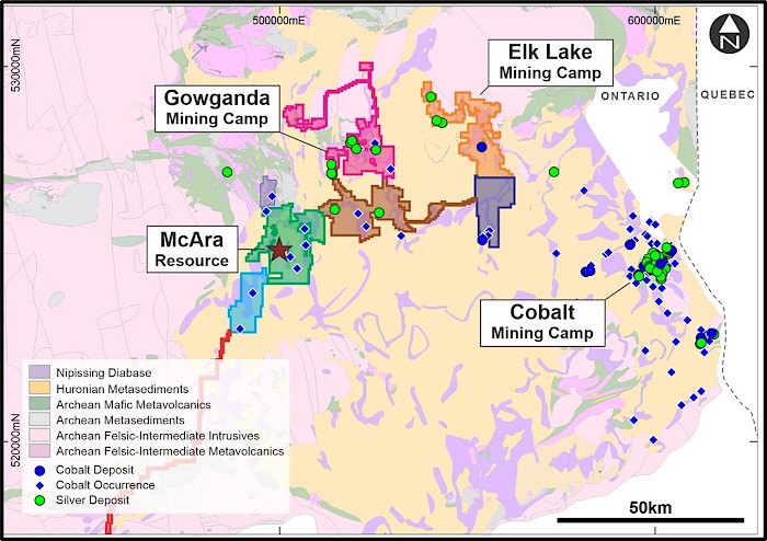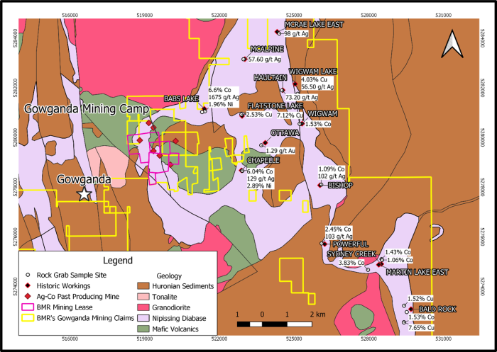 The Gowganda mining camp was one of three historic silver-cobalt districts in Canada’s Cobalt Embayment situated in Northeastern Ontario about 6 hours drive north of Toronto. Estimated historic production from the Gowganda camp (1910-1969) was 60 million ounces of silver and 1.3 million pounds of cobalt. This production was sourced from high-grade silver-cobalt veins hosted in Proterozoic Nipissing diabase intrusions. Thirty-seven mineral occurrences are present within BMR’s Gowganda block which have an extensive exploration & mining history dating back to 1908 when silver was first discovered at Miller Lake (McIlwaine, 1978).