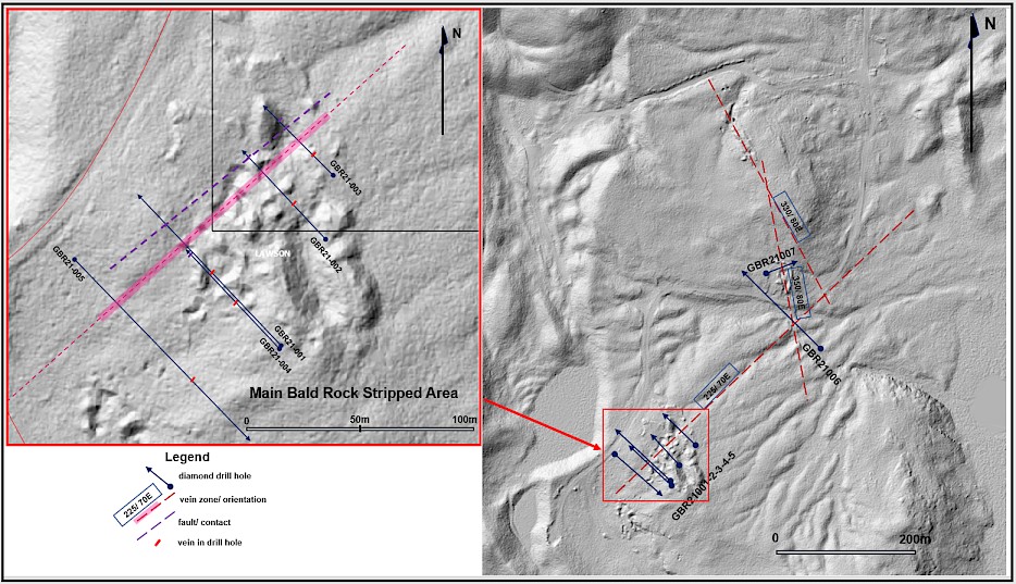 - Five holes,(GBR21001-005) tested the strike and depth extent of the known 10m wide altered and mineralized zone exposed in the main stripped area;